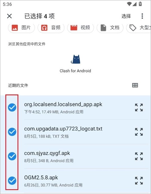 2、选择文件,在传输界面长按需要传输的文件,即可多选
