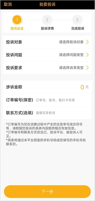 3、填写投诉对象、问题、类型等信息,点击下一步;