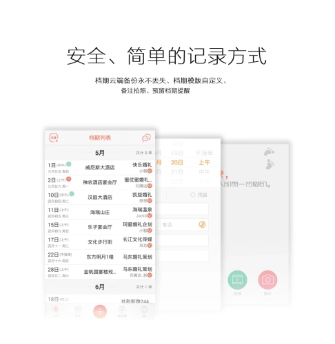 档期云端备份永不丢失、档期模板支持自定义、支持备注拍照功能、预留档期贴心提醒