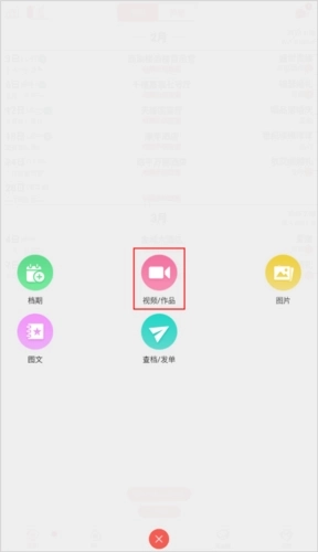 1、打开软件后,点击底部的“+”按钮,选择“视频/作品”选项