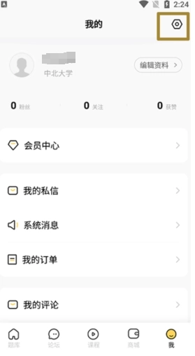 1、打开考研汇应用,进入“我的”页面后,找到并点击右上角黄色方框里的按钮。