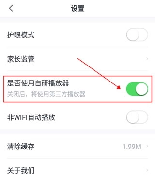 进入设置页面,点开是否使用自研播放器按钮即可。