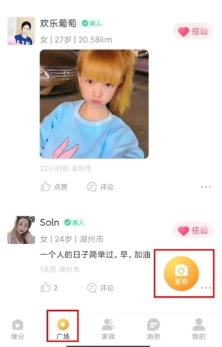 1、在广场页面中点击右下角的发布按钮。