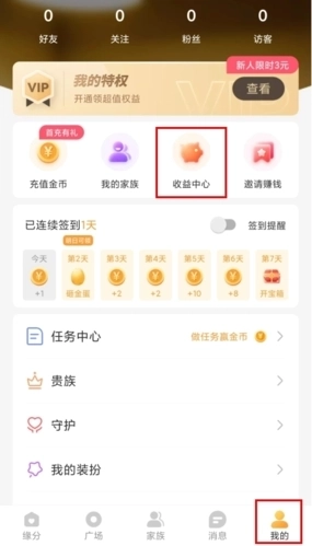 1、在我的页面中点击收益中心按钮。