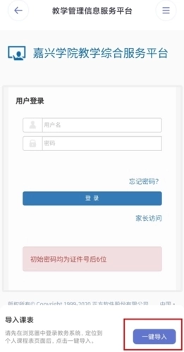 4、输入自己学校的用户们和密码,点击一键导入按钮就可以了。