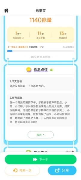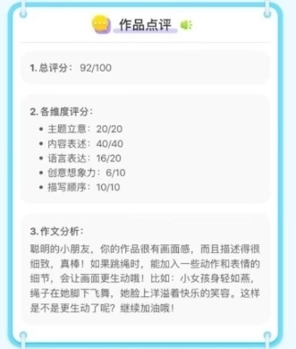 不仅在练习的过程中会对学生的每一次发言,进行及时准确的评价;而且会对孩子最终的作品进行细致点评,找出好词好句,优缺点,并给出优化建议。