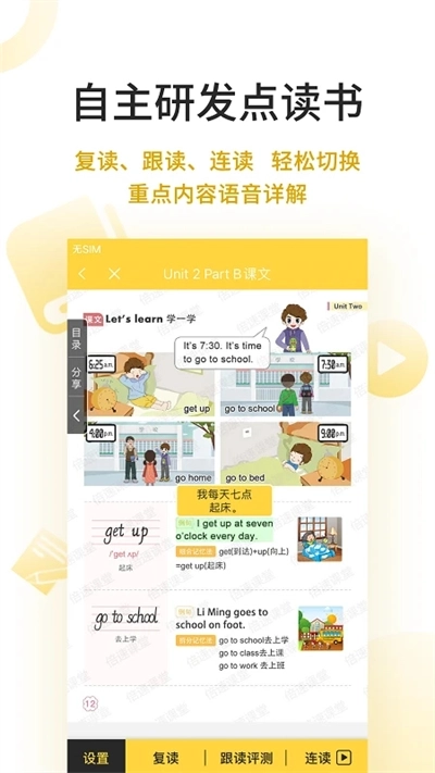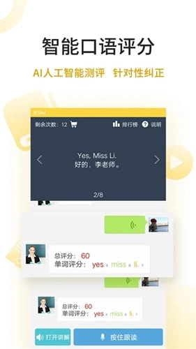 同步课本内容并进行知识拓展,不懂的地方点一点,专业老师语音详解;还有复读、跟读、连读、口语评测等功能。学生可以根据需要自定义选择范围反复朗读,也可跟着老师一起读,AI智能评分,还有老师纠正发音;实时排行榜,让孩子在轻松快乐中学口语。