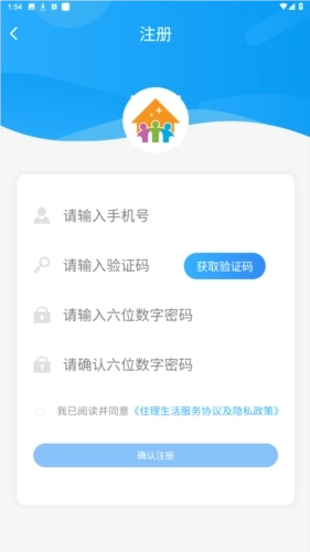 2、在住理注册页面输入手机号、验证码和密码,点击确认注册按钮;