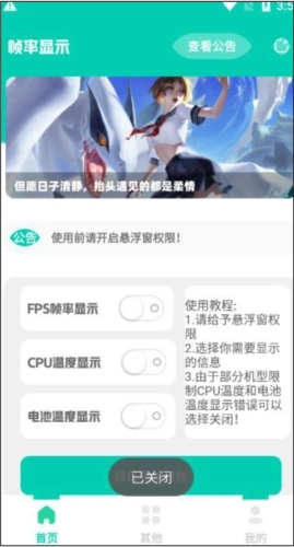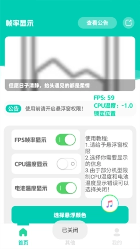 安装好软件后,先给App悬浮框权限。接下来可以根据需要查看的数据开启功能。如果觉得悬浮框颜色不够明显也可调节设置。由于部分机型限制CPU温度和电池温度显示错误可选择关闭。设置成功后即可进入游戏体验,在游戏过程中还可锁定悬浮窗位置避免影响游戏操作。