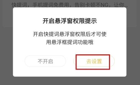 2、在开启悬浮窗权限提示中,点击去设置按钮;