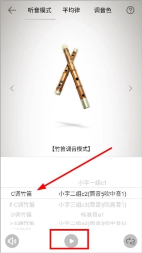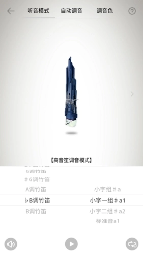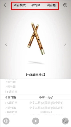 3、进入竹笛调音页面后,可看到听音、十二平均律、调音色三种模式,用户可根据自身需求从中选择一种模式。