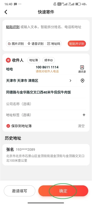 3、通讯录:支持一键选取历史收发地址,还能智能填充地址信息,操作便捷高效。