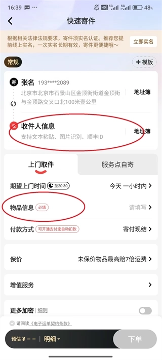 2、输入收件人信息以及邮寄物品信息。