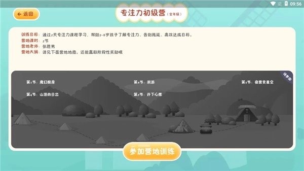 4、测试完成后,您就可以正式开始学习了;软件为用户提供了各种不同的训练营,旨在帮助孩子提高专注力和学习效果;这些训练营涵盖了各种主题和技能,以满足不同年龄段和学习需求的孩子;