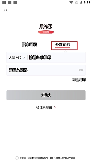 1、在本网站将软件安装到手机后,进入软件进行注册登录操作时,若不是顺丰员工,请选择外部司机注册渠道。
