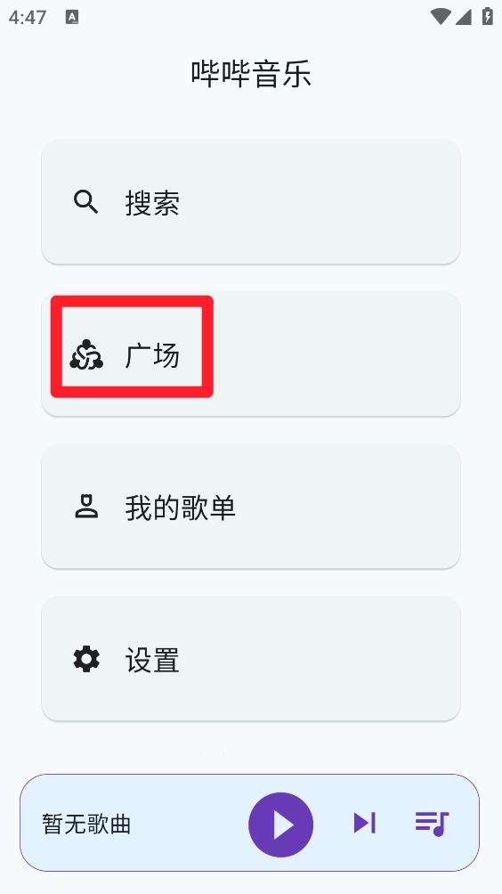 1、用户先在本站完成安装操作,随后打开哔哔音乐应用,进入主页后点击界面上的“广场”选项。