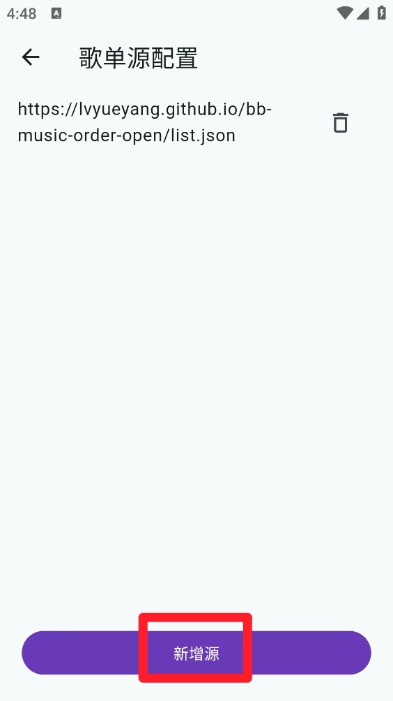 3、如图所示,进入歌单源配置页面后,点击底部的“新增源”按钮。