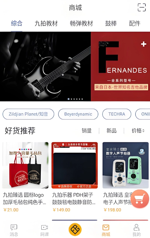 电子商城中除了可以购买乐器及附件产品,还可以购买九拍爵士鼓、吉他、贝司、行进打击乐、马林巴、小军鼓等各个学科的系统教材及全国社会艺术水平考级教材,通过教材扫码解锁功能,在App中可以解锁教材中所有的示范音频和伴奏音频。