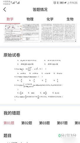 进入答题详情页面后,最上方呈现的是答卷的扫描影像,中间区域展示原始试卷内容,底部则清晰列出每道错题的具体作答记录与对应的正确答案解析。若需切换查看不同学科的答题情况,只需点击页面顶部的学科选项即可。