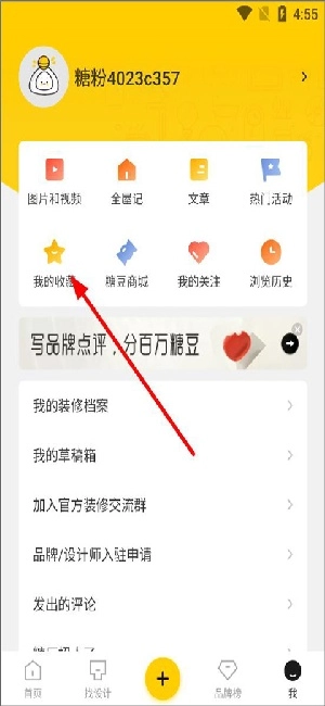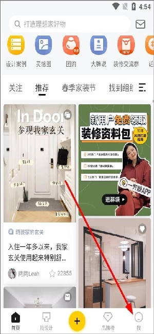 用户登录进入首页后,可直接浏览设计案例、灵感图等内容,之后点击“我的”选项。