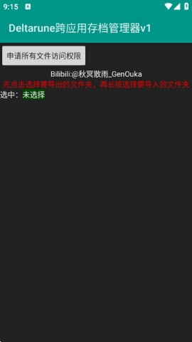 请先确认移动设备上已正确获取并安装好deltarune的游戏文件。接着,在当前界面完成DR跨应用存档管理工具的获取与安装步骤。启动该管理工具后,记得授予它访问文件系统等所需的权限。