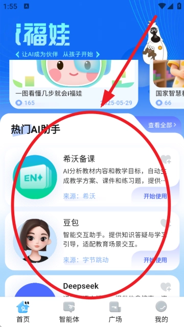 进入i福娃首页,可以查看热门ai智能助手。