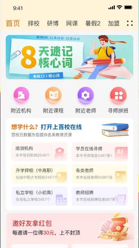 百校在线主要帮助教育机构开展招生营销工作,平台提供多种营销工具供选择使用,能助力机构更高效地策划活动、便捷推进人才培养建设;同时,用户还能查看周边的机构和课程,自由挑选合适的选项;此外,用户也可以浏览相关招聘求职信息,随时进行招聘或求职操作。