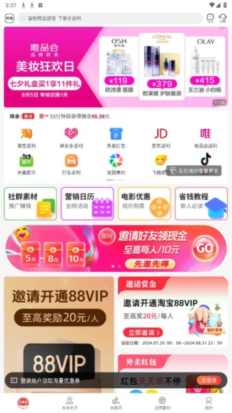 有这样一个电商平台,它的突出特点是拥有高比例的返利体系。和同类平台不同,它不要求用户推广价格高昂的商品,而是聚焦于分享那些实惠又实用的好物,以此让大家在购物时能更有效地节省开支。而且,用户在使用这个平台时,不需要去完成那些规定的等级提升任务,也不用输入邀请码之类的东西,整个过程用起来会觉得轻松又方便。这样的运营方式,既让用户的购物过程更顺心,还能让他们额外获得返利的机会。