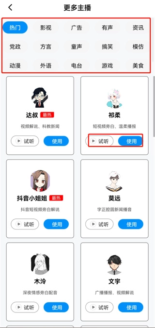 还有不少主播的语音音色可供用户在线上更便捷地查看,能丰富用户日常进行配音合成的选择。