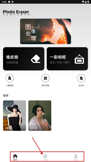 启动Photo-Eraser应用程序后,找到底部菜单栏中的素材入口并点击,即可跳转至素材挑选页面。