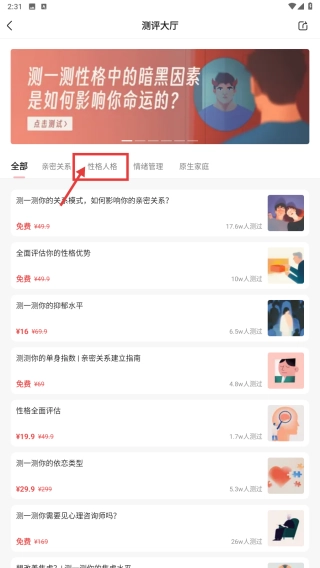 进入测评大厅后,找到并点击性格人格分类的标签,即可浏览该类别下的相关测评内容。
