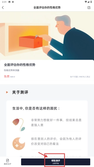 在测评详情页面,点击“领取测评 立即开始”按钮,即可启动性格优势测评。