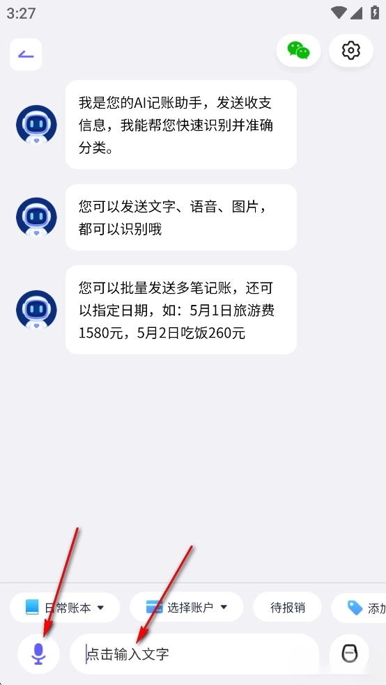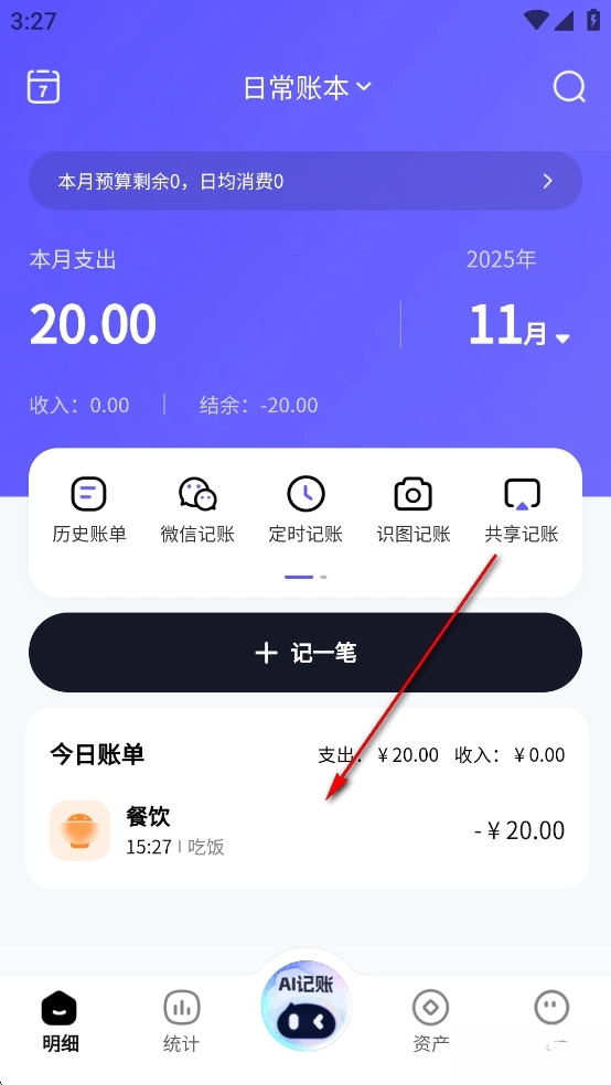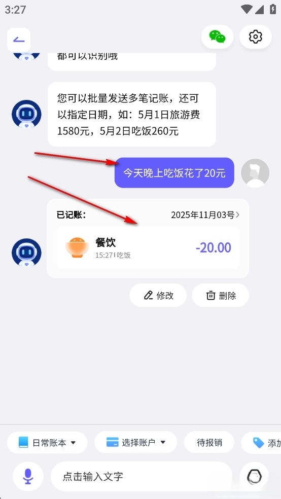 比如“今天晚上吃饭花了20元”,自动进行记账