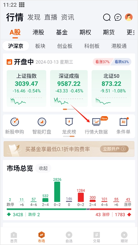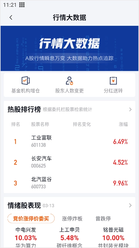 进入软件后,可在行情页面选择“行情大数据”选项,也能通过上方的搜索功能进行查找。