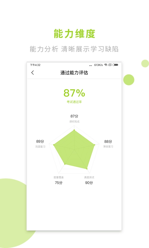 在对学生整体学习情况展开综合分析后,生成可视化的数据分析维度图,围绕各学科考试通过率、综合评分、学习进度、错题难易度等多个维度进行评估,帮助学生直观了解自身过考能力在整体中的占比情况。
