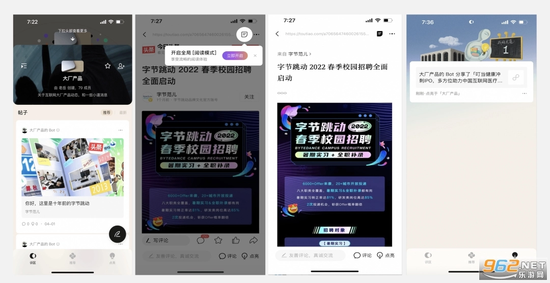 《识区》是字节跳动旗下北京识区无限科技有限公司与今日头条联合打造的智能阅读工具。不同于常见的电子阅读工具——它们往往以固定书架的形式呈现内容,《识区》采用了兴趣圈种草的创新模式:用户可以创建专属圈子,和一群兴趣相投的伙伴在此集结,围绕共同喜爱的话题展开阅读与深度探讨。