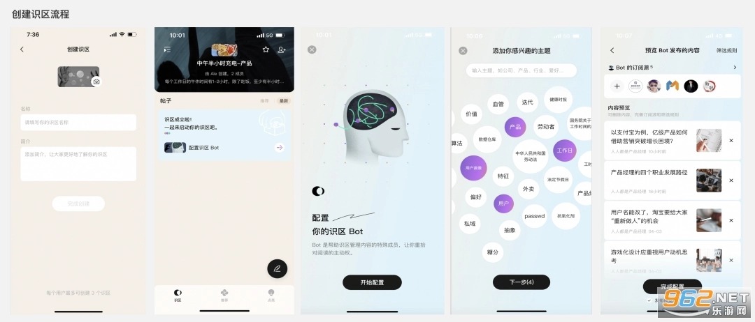 创建识区等同于订阅内容源,你想浏览的各类内容,都能借助机器人Bot来抓取获取,这些内容均源自头条平台。创建识区的具体流程为:完善基础信息→设置Bot配置→选定订阅来源。