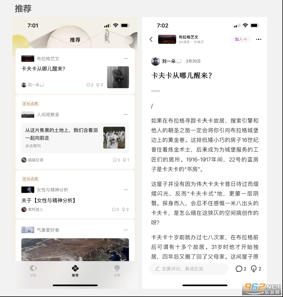 推荐模块的核心作用是助力用户探索更多识区,这里汇聚了区长点亮的帖子与识区原生帖子,功能定位和即刻的“发现”板块相近。