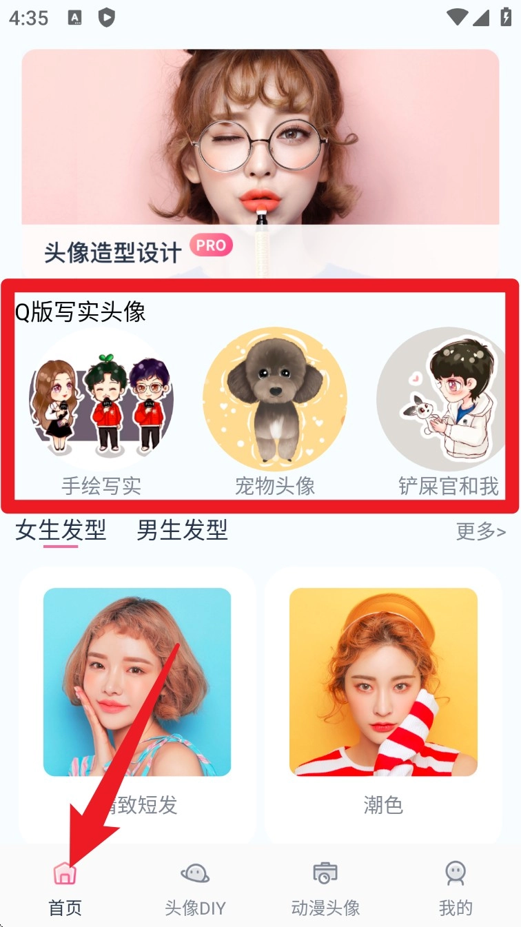 在首页找到Q版写实头像模块并点击进入,之后就能从手绘写实、宠物头像等分类里挑选,开启头像制作流程。