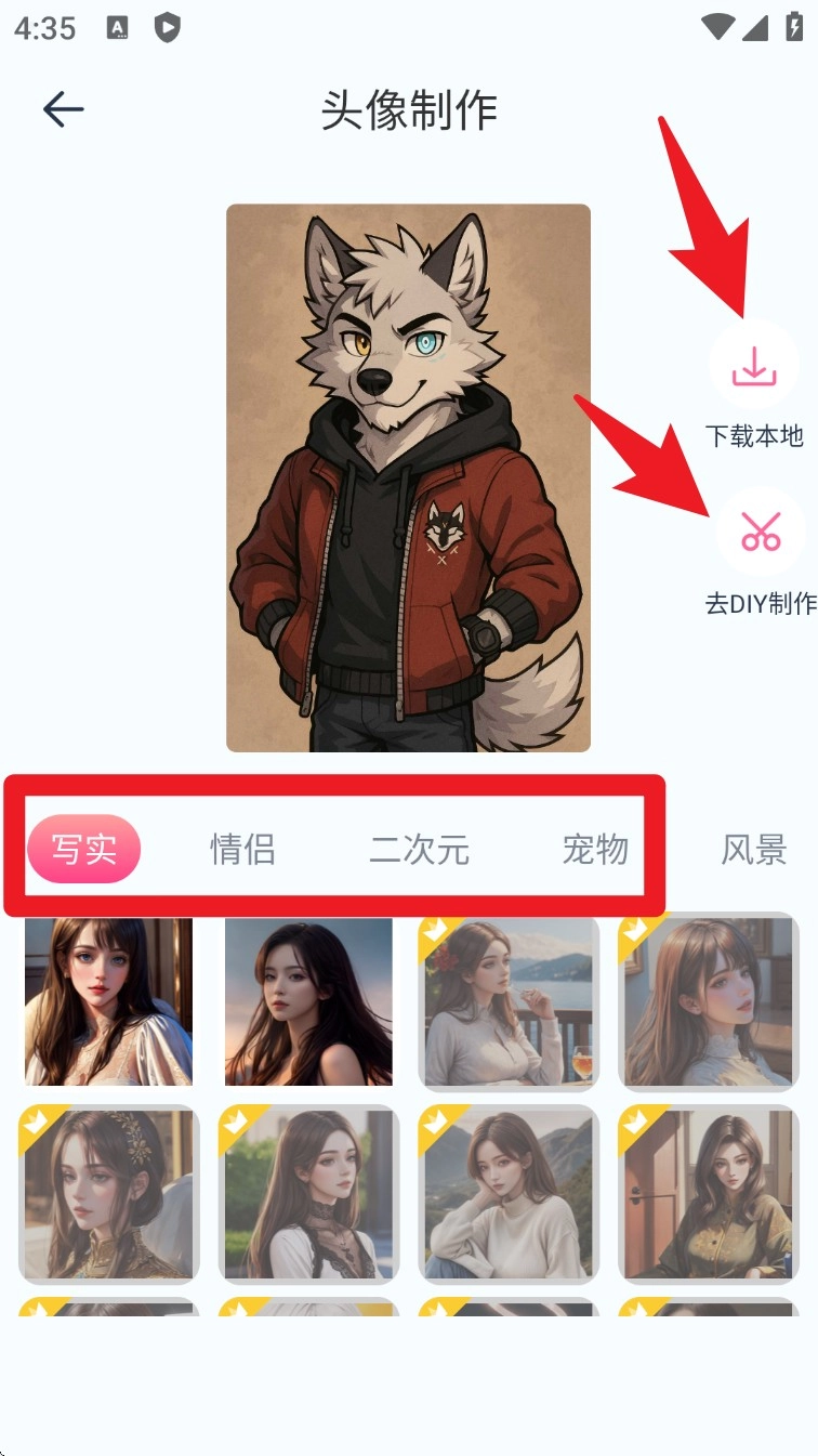 你可以挑选写实风格或二次元风格的模板进入头像制作页面,制作完成后,既能够直接点击右侧的按钮把头像保存到本地,也可以进入DIY制作页面进一步调整头像效果。