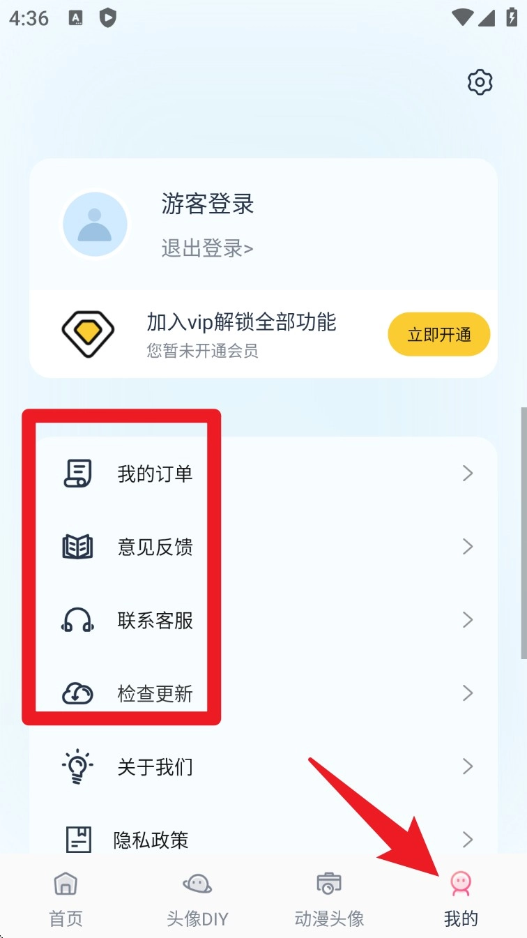 点击下方“我的”栏目,就能查看订单记录、提交意见反馈、联系客服,还可以进行应用更新检查。