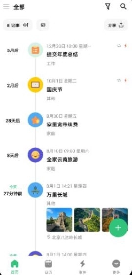 首页:默认呈现所有记录项的时间线,方便您通览所有重要时刻。
