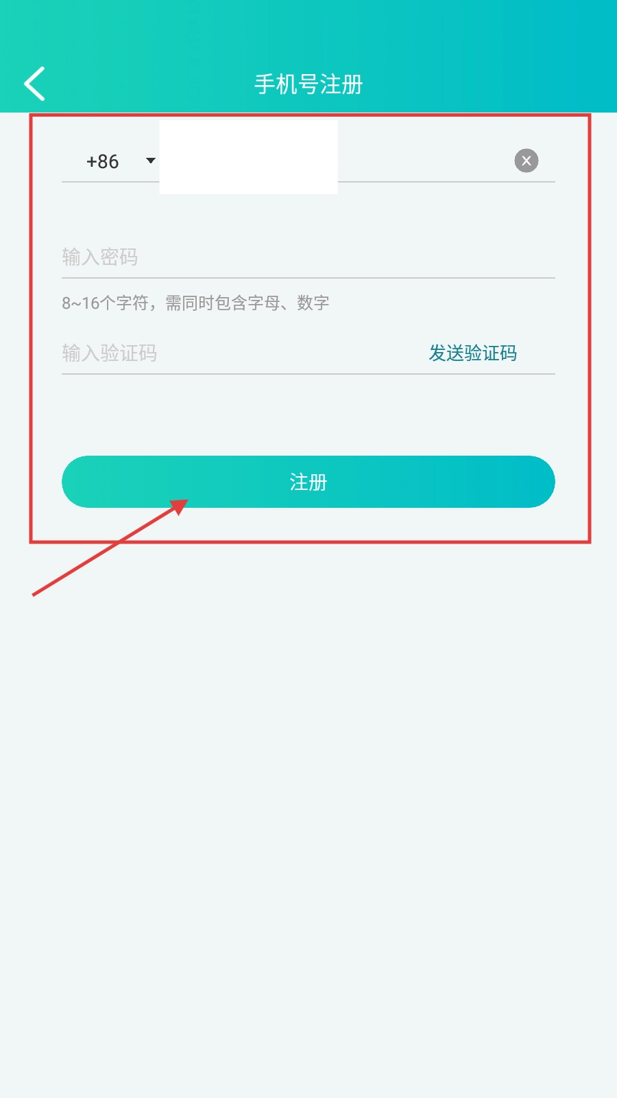 在手机号注册页面,依次输入手机号、设置由字母与数字组成的密码,完成获取并填写验证码的操作后,点击【注册】按钮即可。