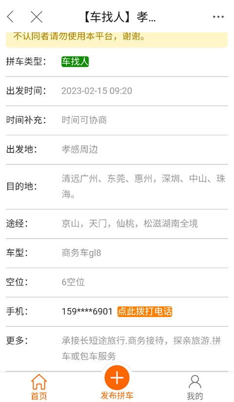 选好分类后,下方就能滑动查看其他用户发布的拼车信息了。