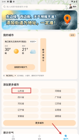 切换至天气查询页面后,既能查看“我的城市”的天气状况,也可以添加更多城市,像山东省这类地区的天气信息也能一并查看。