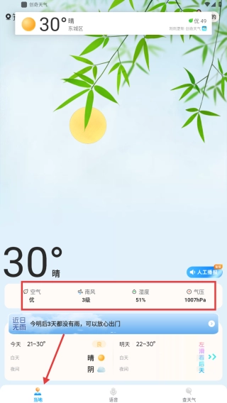 打开天气应用,进入本地页面后,查看东城区的实时天气状况:当前温度30摄氏度,天气晴朗,同时还能看到空气质量、风力、湿度、气压等详细数据,以及未来几日的天气提示信息。