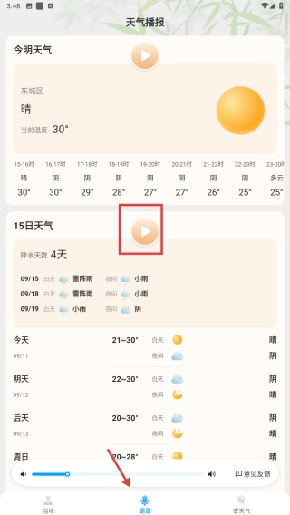 点击底部的语音选项,进入天气预报界面,查看今明两天各时段的温度变化情况,同时了解15日的天气状况,掌握未来降水等天气发展趋势。
