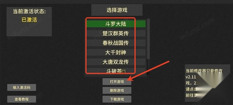 注:当前只能修改v2.11.1版本以上的游戏,2.9版本以下的游戏请点击“游戏”按钮前往更新游戏