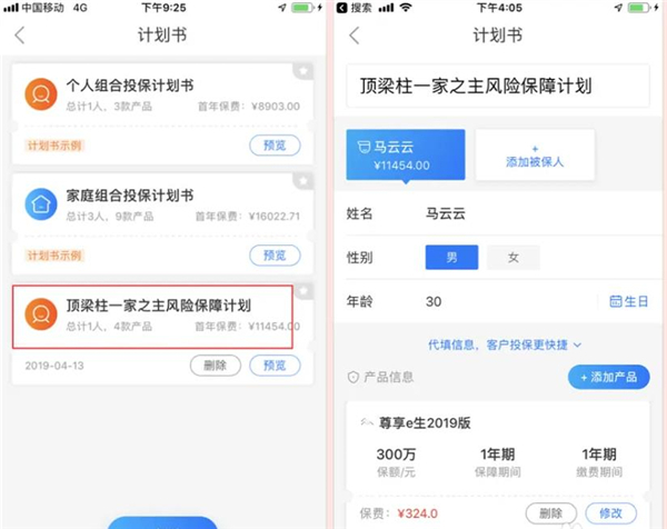 在编辑页面中,i云保的各位个人保险代理人需填写计划书名称、被保人姓名,以及为被保人搭配的产品组合。该计划书允许为多个被保人分别设置不同的保险组合方案。