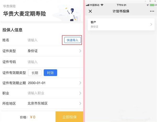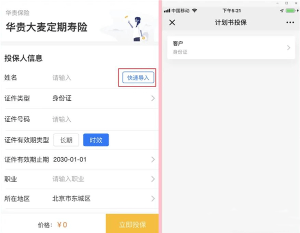 帮助客户完成健康告知后,即可进入投保页面,这里支持点击“快速导入”功能,快速填充在计划书阶段预先代录的客户信息。同时,计划书中选定的投保产品会同步进入订单列表。另外,同一份计划书转发出去后,不同客户可以直接打开进行投保操作,且彼此的投保流程互不干扰,因此可以放心地将计划书挂载在公众号及其他互联网场景中用于展业。